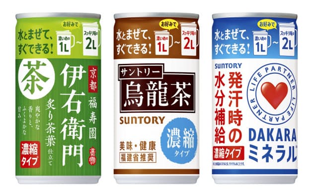 展開するのは緑茶「伊右衛門 炙り(あぶり)茶葉仕立て濃縮タイプ」、ウーロン茶「サントリー 烏龍茶 濃縮タイプ」、スポ…