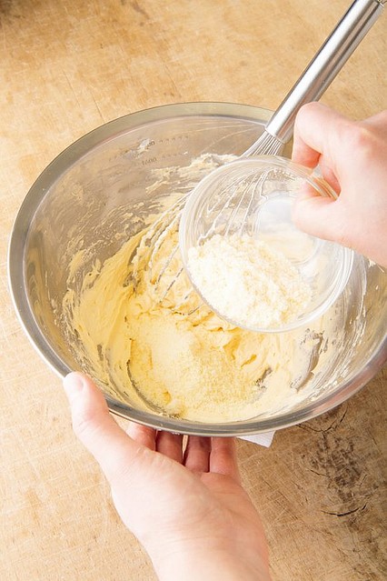 (2) (1)に溶き卵を3〜4回に分けて加え、その都度泡立て器でよく混ぜる。粉チーズを加えて混ぜ、A、牛乳の順に加えて、その都度練らないようにさっくりと混ぜる。カマンベールチーズを加え、さっと混ぜる。
