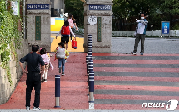 (인천=뉴스1) 정진욱 기자 = 21일 오전 인천시 미추홀구 문학초등학교에서 초등학생이 등교를 하고 있다. 초등학생 등교는 지난달 26일 수도권 집단감염이 잇따르며 코로나19 확산세에 고3을 제외한 모든 학교의 등교가 중단된 지 26일만이다. 2020.9.21/뉴스1